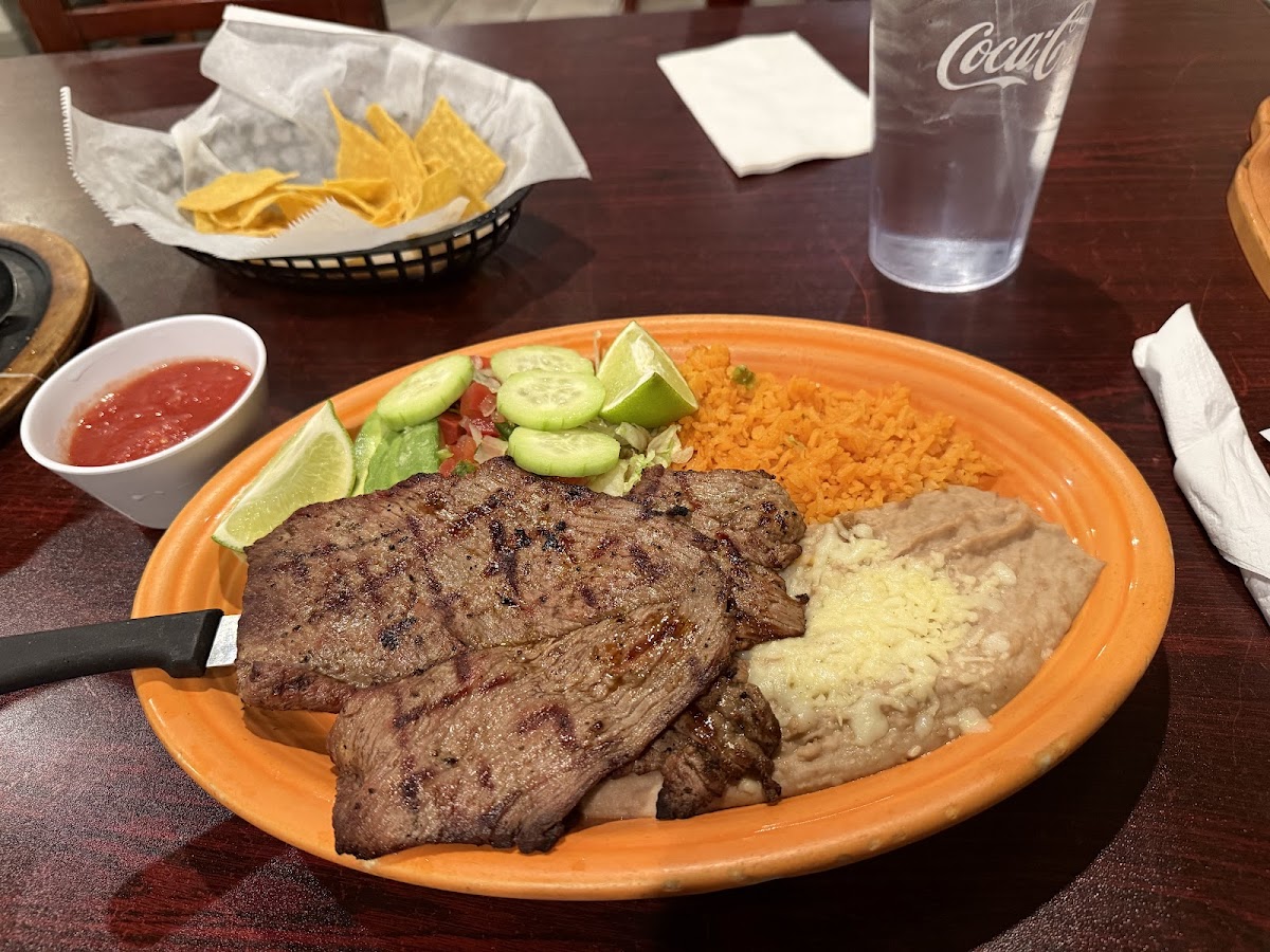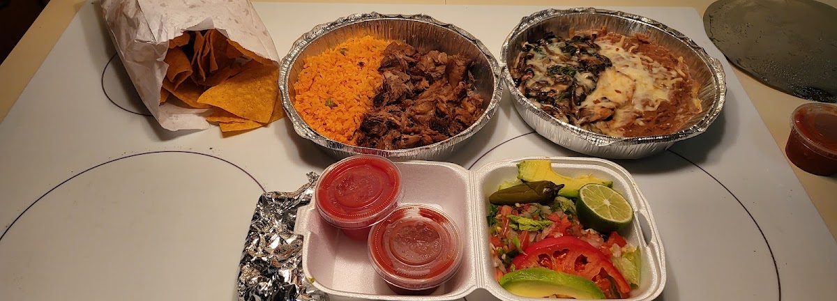 My husband had the steak fajitas, I had the chicken Alambre, (both of us chose extra rice instead of refried beans.) Our three children ordered the beef soft taco, chicken soft taco and a hamburger. We also ordered queso to go with the complimentary chips and salsa. (Which came with one mild salsa and one medium/hot salsa.) Everything was prepared in a reasonable amount of time in a busy restaurant. The temperature was satisfactory as was the flavor of each of our meals. We love food and the prices are reasonable as well. All 5 meals with drinks and queso came to $69 before tip. It may not look like a fancy place from the dated building but give them a try. They are friendly and definitely worth the visit.